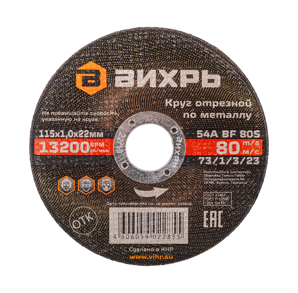 - Круг отрезной по металлу 115х1,0х22 мм Вихрь, , Шт